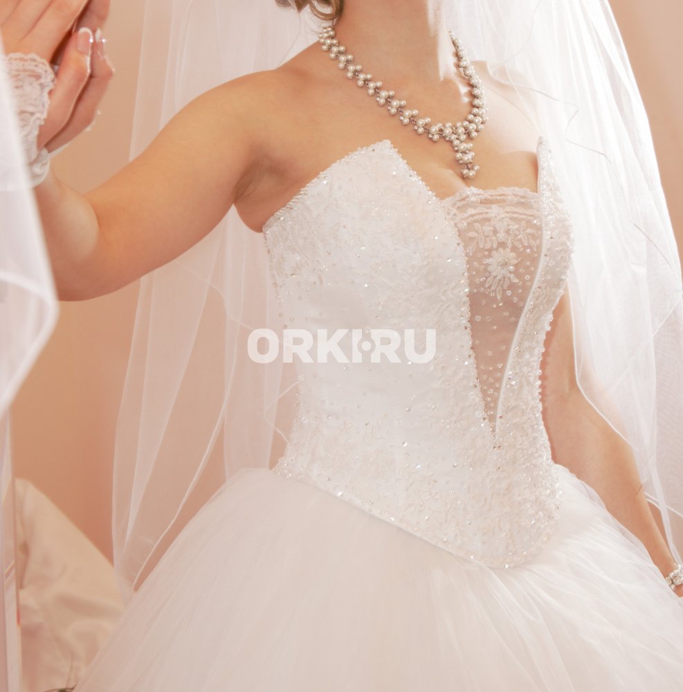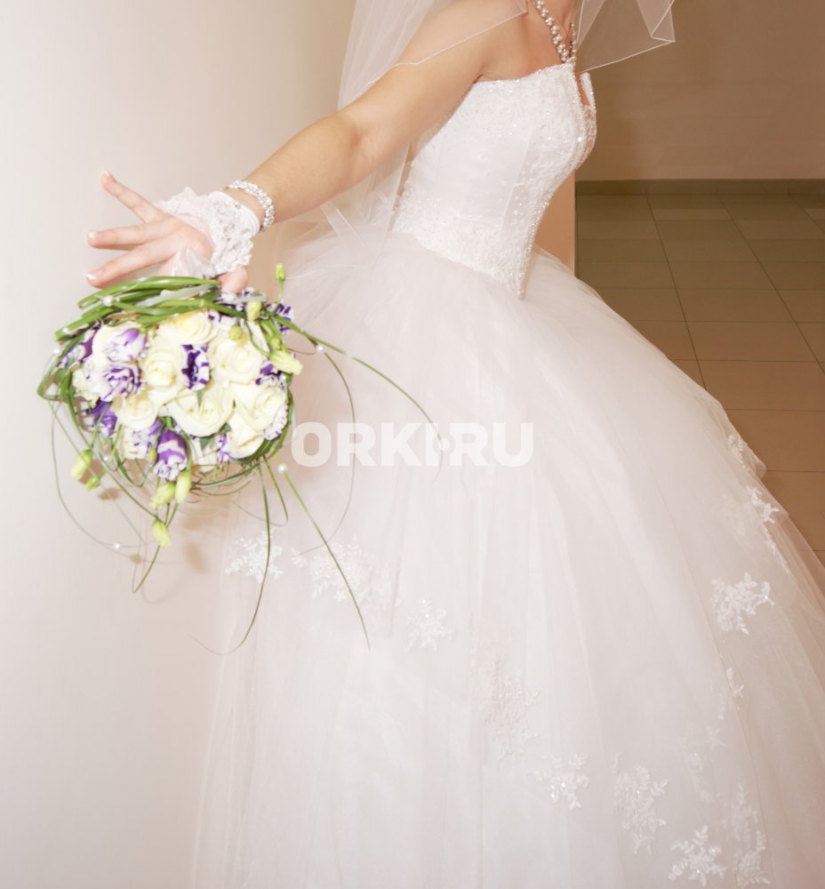 Шикарное белоснежное свадебное платье, корсет расшит благородно переливающимися стразами, размер 44-46, куплено в салоне Allure (есть чек), 5 колец. В идеальном состоянии после химчистки. Бижутерия и митенки в подарок. При покупке платья отдам очень красивые туфли р.38. |