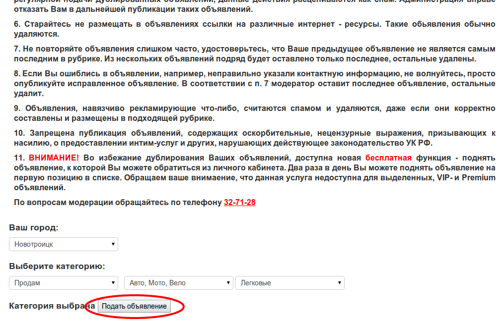 Ознакомившись с правилами размещения объявлений, выберите нужный раздел и нажмите кнопку "Подать объявление"